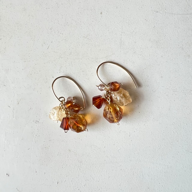 シリーズ【カフェに行きませんか】 こちらは『今日は紅茶の気分』です。 いつもはコーヒー派の方も、たまには紅茶もいいんじゃない?って日があるのでは。 はちみつ色のファントムシトリン、紅茶色のヘソナイトガーネット、レモンを入れた紅茶は淡い色のシトリンのよう。 紅茶色の石たちがゆらゆら耳元で揺れるのが可愛らしい。 気分を変えたい日にぴったりな耳飾り。 もちろん、いつも紅茶派の方にもオススメです。 シリーズ【カフェに行きませんか】 仕事中にちょっと疲れた時、または気の合う人たちとのおしゃべりに花を咲かせたい時 大切な人とのおでかけ… 大好きなカフェに、行こうかな、一緒に行きませんか? 一人で行きたい時、誰かと行きたい時、いろいろあると思いますが そんな気分の時にふと思い出してつけていきたくなるようなイメージで作った耳飾りです。 天然石を使用しているため、色や形に多少の個体差が生じることがあります。 また、細かな内傷が見られることがありますが、原石に由来するものです。 それも天然石の楽しみの一つとしてご理解ください。 金具の変更を希望される場合はオプションよりご希望の金具をお選びください。 ◇お手入れ◇ ・水濡れや汗等で劣化する場合があります。使用後は柔らかい布等で金属部分を拭き、引き出しの中など光の当たらない場所に保管してください。 ・落としたりすると割れる場合があります。取り扱いには十分ご注意ください。 ◇使用材料◇ 使用石:ファントムシトリン、シトリン、ヘソナイトガーネット、アンデシン ピアスフック:14kgf アーティスティックワイヤー その他金属部分:真鍮にメッキ ◇ご使用上の注意◇ 金属アレルギーに配慮した金具を使用していますが、まれにアレルギーを起こす方がいらっしゃいます。 該当する方はご使用にならないでください。 該当されない方でも着用中に痒み等の違和感を感じた場合は直ちに使用をやめ、専門医にご相談ください。