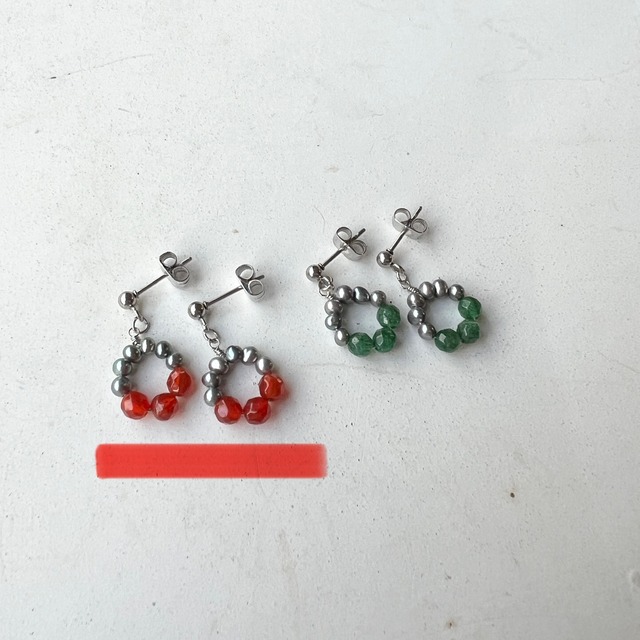 シリーズ【いしのわ】 石たちを丸く並べて繋いだ耳飾り。小ぶりで普段使いにピッタリです。 こちらは淡水パールとレッドアゲート(赤)の組み合わせになっています。 (画像1枚目下線を引いた方) 天然石を使用しているため、色や形に多少の個体差が生じることがあります。 また、細かな内傷が見られることがありますが、原石に由来するものです。 それも天然石の楽しみの一つとしてご理解ください。 金具の変更を希望される場合はオプションよりご希望の金具をお選びください。 ◇お手入れ◇ ・水濡れや汗等で劣化する場合があります。使用後は柔らかい布等で金属部分を拭き、引き出しの中など光の当たらない場所に保管してください。 ・落としたりすると割れる場合があります。取り扱いには十分ご注意ください。 ◇使用材料◇ 使用石:淡水パール(染め)、レッドアゲート 金属部分は全てサージカルステンレス(SUS316L) ◇ご使用上の注意◇ 金属アレルギーに配慮した金具を使用していますが、まれにアレルギーを起こす方がいらっしゃいます。 該当する方はご使用にならないでください。 該当されない方でも着用中に痒み等の違和感を感じた場合は直ちに使用をやめ、専門医にご相談ください。