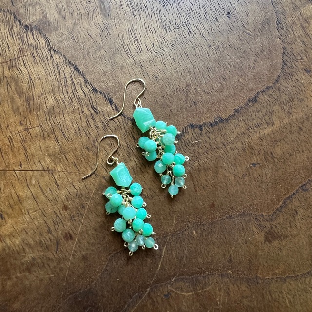 爽やかなアップルグリーンのクリソプレーズ。 形状違いの粒を合わせて動きのある耳飾りに仕上げました。 明るめのグリーンが顔周りを華やかにしてくれます。 天然石を使用しているため、色や形に多少の個体差が生じることがあります。 また、細かな内傷が見られることがありますが、原石に由来するものです。 それも天然石の楽しみの一つとしてご理解ください。 金具の変更を希望される場合はオプションよりご希望の金具をお選びください。 ◇お手入れ◇ ・水濡れや汗等で劣化する場合があります。使用後は柔らかい布等で金属部分を拭き、引き出しの中など光の当たらない場所に保管してください。 ・落としたりすると割れる場合があります。取り扱いには十分ご注意ください。 ◇使用材料◇ 使用石:クリソプレーズ ピアスフック:14kgf アーティスティックワイヤー その他金属部分:真鍮にメッキ ◇ご使用上の注意◇ 金属アレルギーに配慮した金具を使用していますが、まれにアレルギーを起こす方がいらっしゃいます。 該当する方はご使用にならないでください。 該当されない方でも着用中に痒み等の違和感を感じた場合は直ちに使用をやめ、専門医にご相談ください。