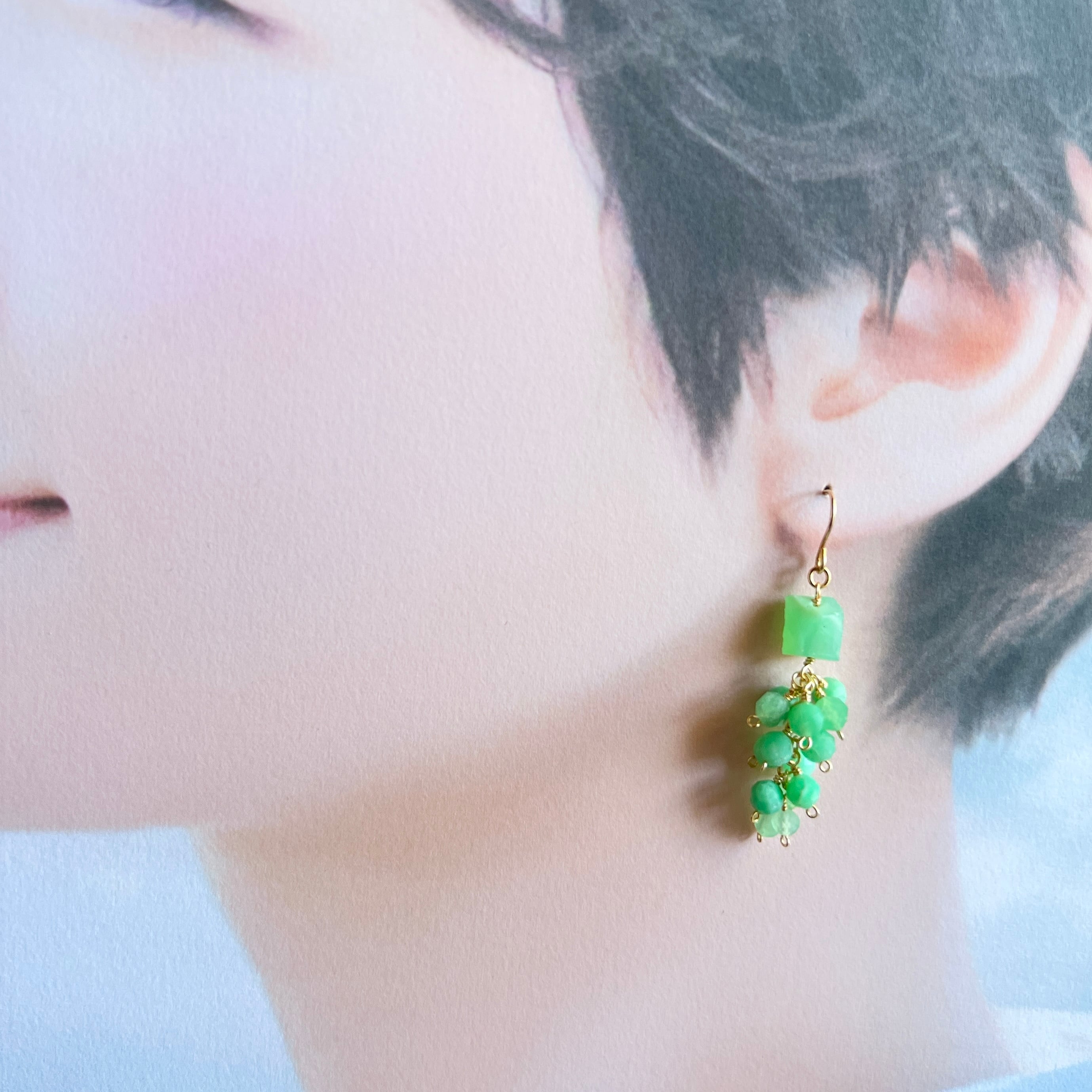 形状違いの粒を合わせて動きのある耳飾りに仕上げました。