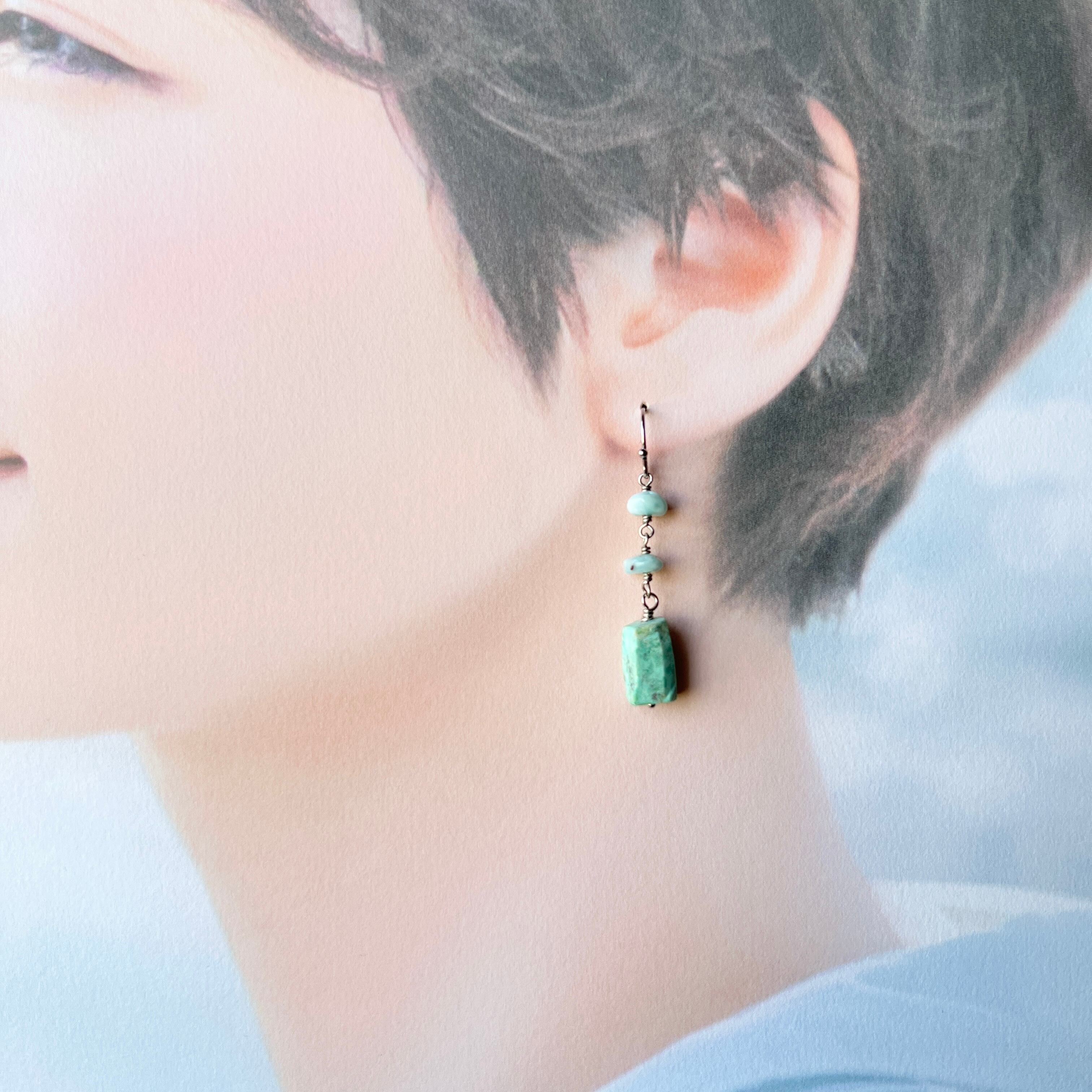 ラリマーのチップとラフにカットされたクリソコラの耳飾りです。